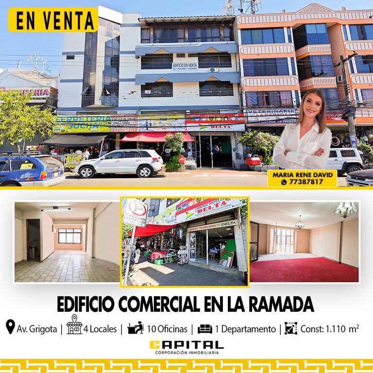 EDIFICIO EN VENTA EN LA RAMADA!! En la zona más comercial y de mayor plusvalía de Santa Cruz, está este edificio que factura cada minuto 4 pisos – 1.110 m² construidos Precio: $us 1.500.000 PLANTA BAJA: - 4 tiendas comerciales que rentan casi 50.000 bs al mes PISO 1 y 2: - 10 oficinas con baño privado cada una PISO 3: - Amplio departamento de 3 dormitorios para vivir o alquilar Terraza con churrasquera, depósitos y espacio para vallas publicitarias Estas oportunidades no aparecen todos los días. Escribime y conocelo antes que te lo ganen: Maria Rene David Asesor Inmobiliario - Capital Corporación Inmobiliaria Cel: 773-87817